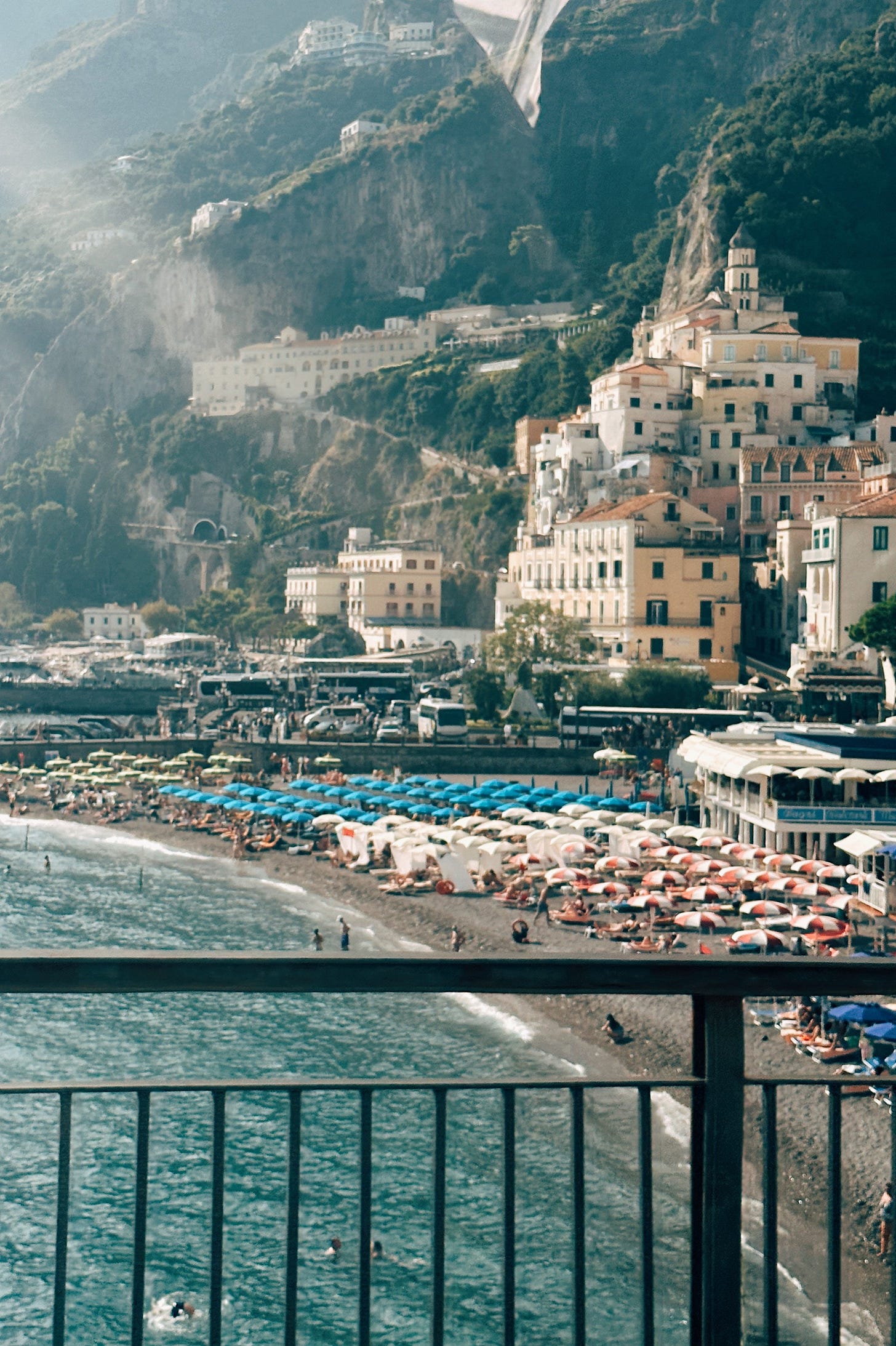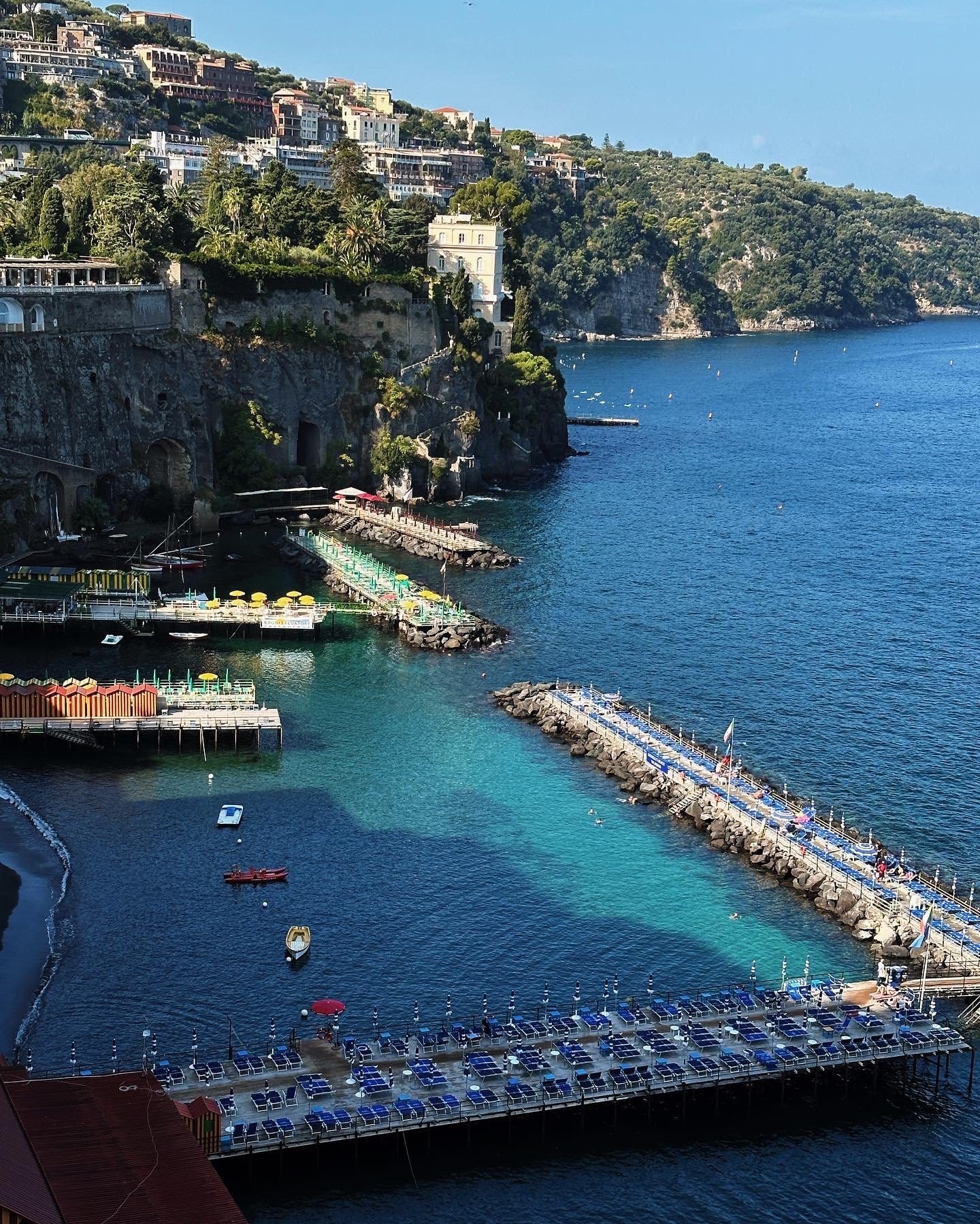 Sorrento is about an hour drive south of Naples, and is just around the peninsula from the Amalfi Coast. It’s very easy to get into and around. There are some hills and steps, but they are minimal compared to the likes of say, Positano. Our driver was able to drop us directly in front of the hotel with our bags (sorry to this TikToker). We were 2 blocks from the central square, main shopping street, and a 5-minute walk to the waterfront. The waterfront cliff has an elevator down to beach level/the marinas. For a small fee, you can pick a beach club and lounge/eat/swim should you choose. It was certainly warm enough to do so. Also from the marina, you can take ferries to Capri, Naples, Positano and more.